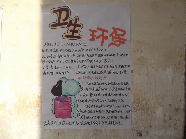 宣传海报上主要有两方面的内容:一方面是关于科技与文化的内容,主要介绍了科学发展观的内涵及在党的领导下所取得的科学成就。意在展现在党的正确领导下,科技迅猛发展,并鼓励孩子们努力学习科学文化知识,也让村民和孩子们了解了当今科技的发展状况;另一方面是宣传卫生与环保。周围生存环境的好坏直接影响到我们的工作、学习及生活,所以我们需要爱护好我们的环境。为了爱护好我们的环境,需要做到不乱扔垃圾,并及时清理垃圾、以爱护环境为己任和从我做起,从现在做起这三点。对于环保,我们需要做到减少浪费、重复使用及回收利用。