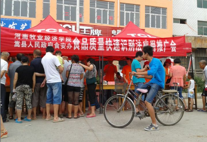 夏季是食品安全事故的易发期,为增强群众的食品安全意识,增长辨别食品优劣真伪的知识,7月3日至5日,质检系暑期社会实践服务队联合嵩县食品安全办公室先后在嵩县县城、田湖镇菜市场、伊河河畔公园举办了三场“食品质量快速识别方法”应用推广活动。队员们现场示范,重点向基层民众宣传介绍肉制品质量的鉴别方法以及食物营养搭配方面的知识,得到过往群众欢迎和好评。