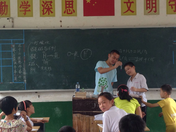 (通讯员 周逸 胡前锋)7月12日上午,湖南师范大学赴望城白箬中学爱在白箬铺暑期实践队成功开展一堂神奇的化学实验课。爱在白箬铺队员康杰辉主持课堂。白箬中学初一全体学生参与课堂。
