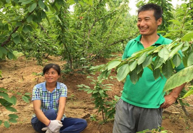 清晰地记得看见樱桃园的那一天,虽然过了樱桃成熟的季节,充满眼帘的浓郁的樱桃林的绿色刺激了每个“萤火虫”的眼球,穿过视觉中枢,一直抵达心脏。椭圆带尖儿的叶片,清晰的纹络,棕褐色的树干,一棵棵樱桃树似清纯的少女,美丽典雅而不妖娆。然而,这樱桃林的主人淡淡的笑了,讲起了这樱桃林的故事,不古老却很悠长。樱桃树在栽种七年之后才会结果,十年起结果数量增多,十五年达到鼎盛时期,之后开渐渐出现病虫害,一般寿命在二十年左右。眼前这片不大不小的樱桃林里的樱桃树是主人新婚之后,背着孩子,一家人一起栽种,转眼十五年过去了,孩子十五岁了,这樱桃林也十五岁了,每一棵樱桃树都像自己的孩子。种树的人老了,孩子长大了,这樱桃树的生命也渐渐走到了尽头,这段奇缘即将落幕,任谁也难以割舍。讲罢故事,主人起身走上半坡,扶着树干,看看地,看看天。“萤火虫”还沉浸在故事的伤感里,立在坡下,未曾看到主人眼角浸满的老泪。离开的时候,是阴天,回头望望这樱桃林,一辈子,一片林,两代人。