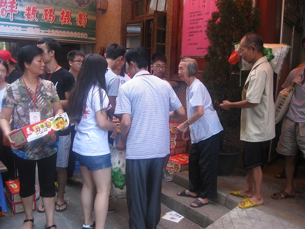 “孩子们,你们真有心,我老人家今年83岁了,第一次有你们这群孩子来关心我,说实话,我们这些没儿没孙的老人家吃什么并不重要,我们只是希望能有像你们这样的孩子常来走动,陪我们聊聊天,帮我们按按摩,这样我们就知足了!”王贤珍老奶奶红着眼眶,双手紧紧扯着衣角,用略带恳求的语气说。正在帮老人家按摩放松的队员陈烨丹突然停住手,咽了咽喉说道:“奶奶,您放心,您待会带我们去您家,放假了,我们还会回来看您的,陪您聊聊天,嗯,就陪您聊聊天……”诚然,扛大米、送药品上门对老人家来说并没有特别的意义,他们只是简单希望能有人陪他们聊聊天,常去走动走动,几乎每个年轻人都可以做到的事,却成为他们生活中最大的奢望。献爱心不能只是局限在资金和物资,更重要的是带去老人家最需要精神上的关爱。而他们最想要的,也只是有人常去看看他们,仅此而已!