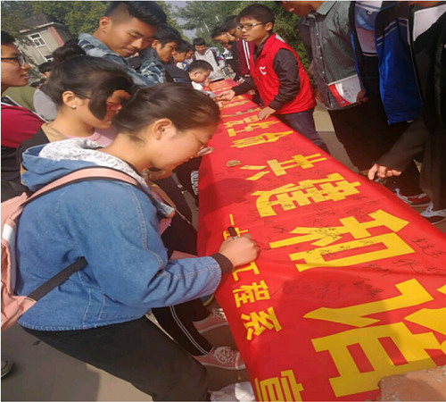 在下课之前志愿服务队队员做好了准备工作,提前布置好现场,下课后学生们看到横幅,纷纷前去询问,队员们详细的为他们讲解这次反邪教签名活动的原因和意义。学生们签名热情十分高涨,许多老师也闻讯前来签名,询问活动的进程。活动最后,服务队队员把横幅挂了起来,满满的签字,体现了我校师生良好的思想觉悟,展现了当代大学生反对邪教,珍爱生命的决心。